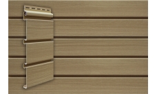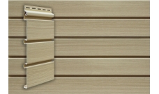 Напоминает доску для обшивки фасада с закругленными или скошенными торцами. Текстура дерева на сайдинге делает его вид максимально натуральным.